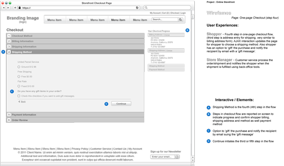 Shopper - Fourth step in one-page checkout flow, (third step is address entry for shipping, very similar to billing address form). AJAX interaction updates the page for shopper to choose a shipping method. Also shopper has an option to ‘gift’ the purchase and notify the recipient by email with a ‘gift message’.